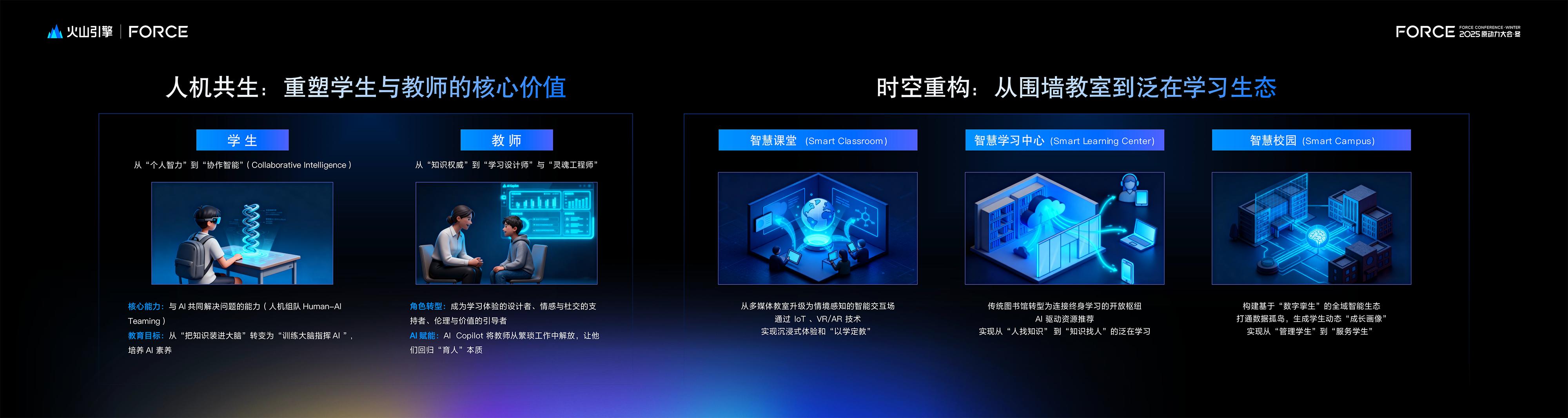 本次论坛集中呈现了火山引擎携手众多院校在不同教育场景中的AI落地探索:从助力教师专业能力升级,到打造高质量交互与反馈的未来课堂,从重构学习中心的学习互动和知识服务形态,到打造以统一AI 基础设施支撑运行与治理的未来学校,一条由点及面、由场景走向体系的“AI+教育”演进路径正逐步清晰。