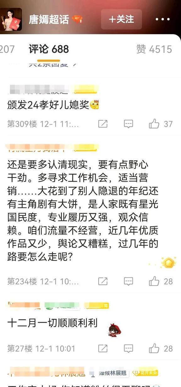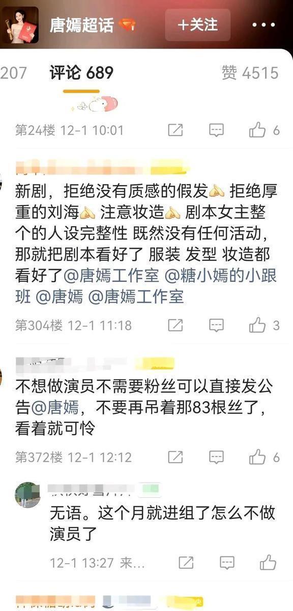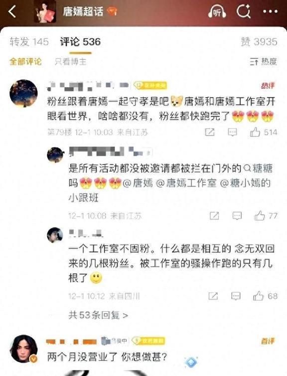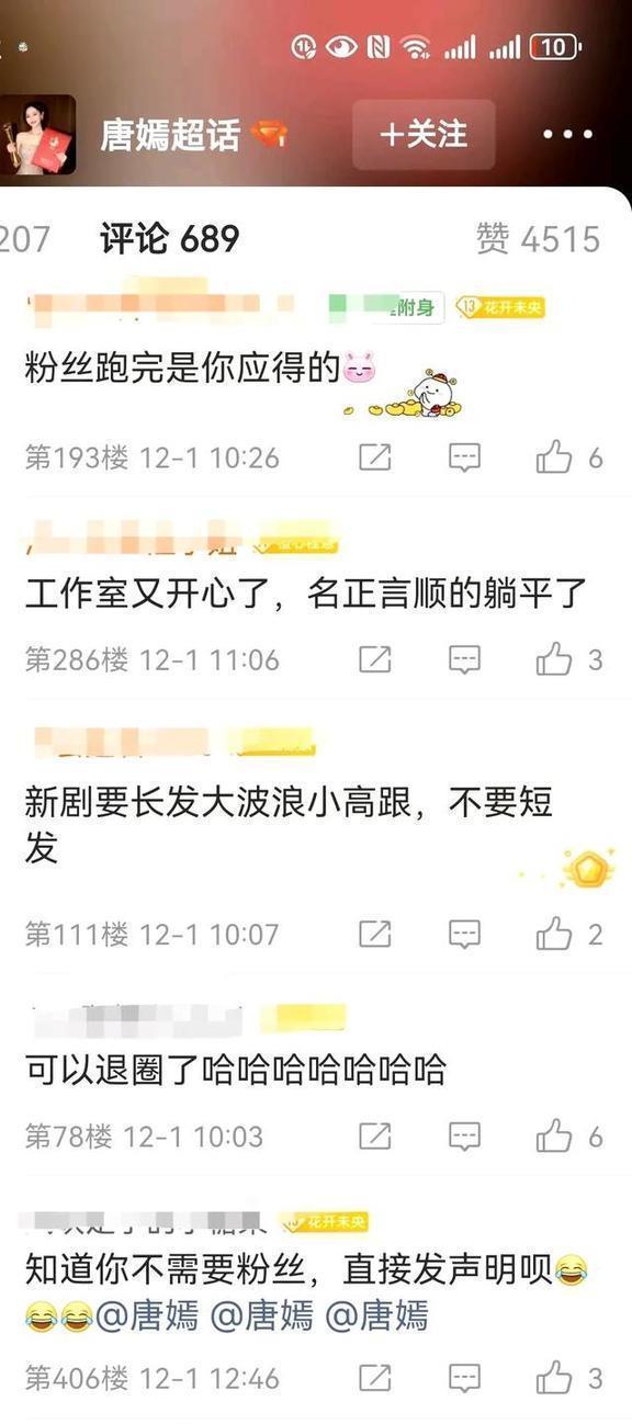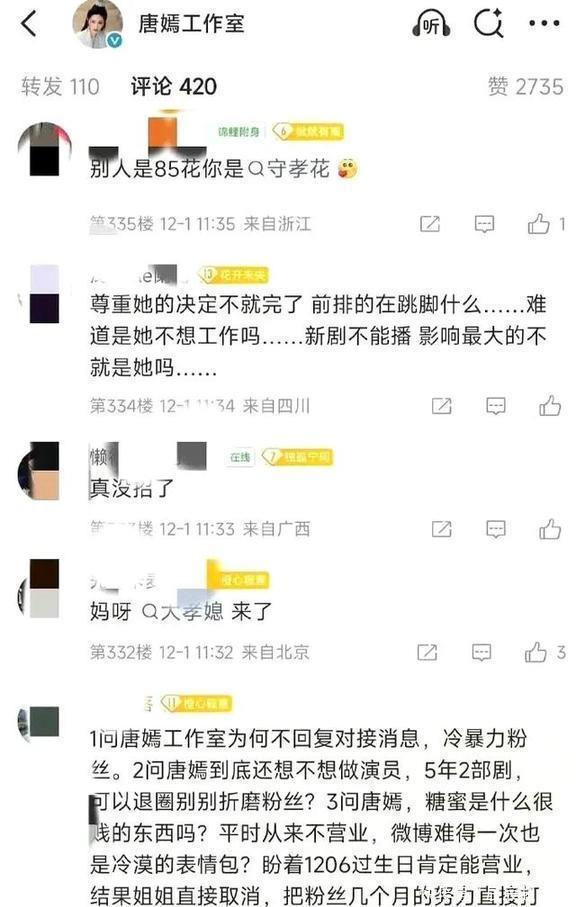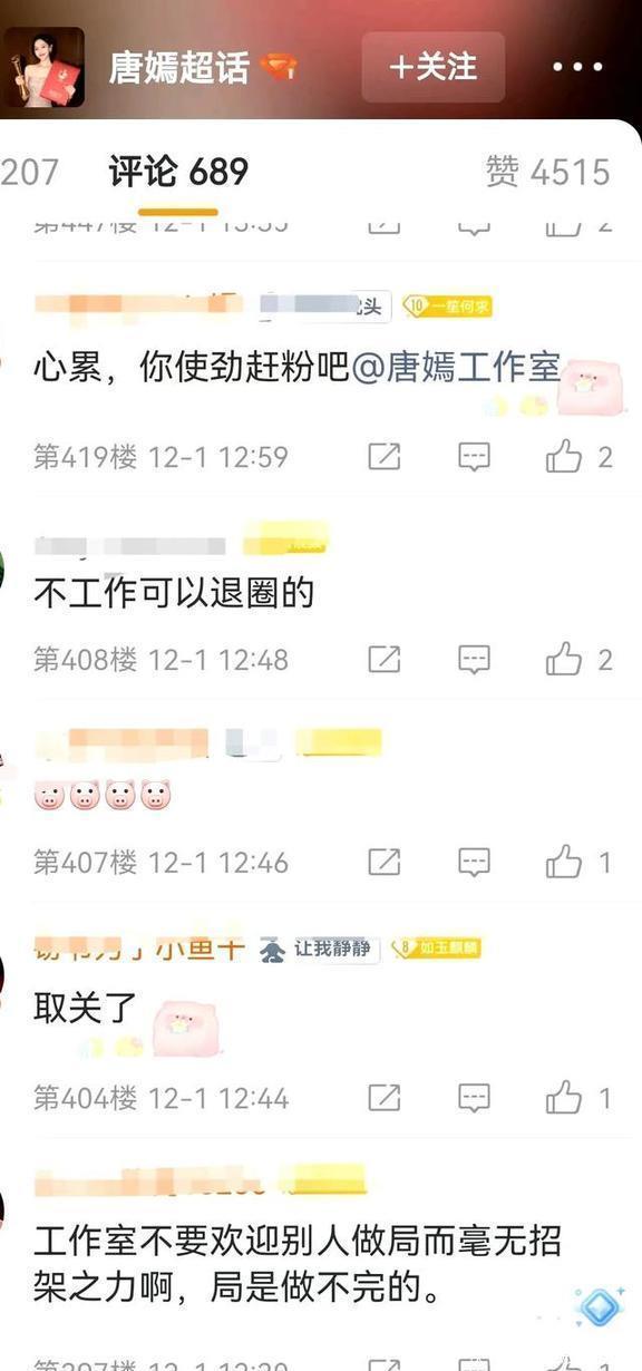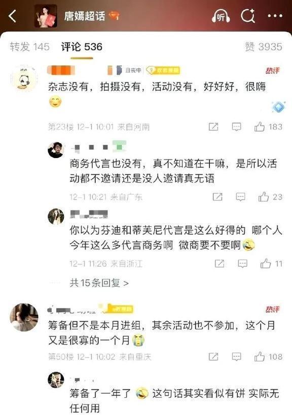 12月的娱乐圈刚开始就挺热闹的,唐嫣这边先闹腾了一下。12月1号,唐嫣的粉丝们热闹得不得了,很多粉丝冲到唐嫣和工作室的社交账号下留言。话都说得挺重:“五年才出两部戏,她还打不打算继续当演员呀?”“连过生日的活动都不办了,长时间没开门,这是不是要退出游戏的意思啊?”有些人直接撂话说“要退粉”,把“唐嫣工作室不作为”的事炒得热火朝天。